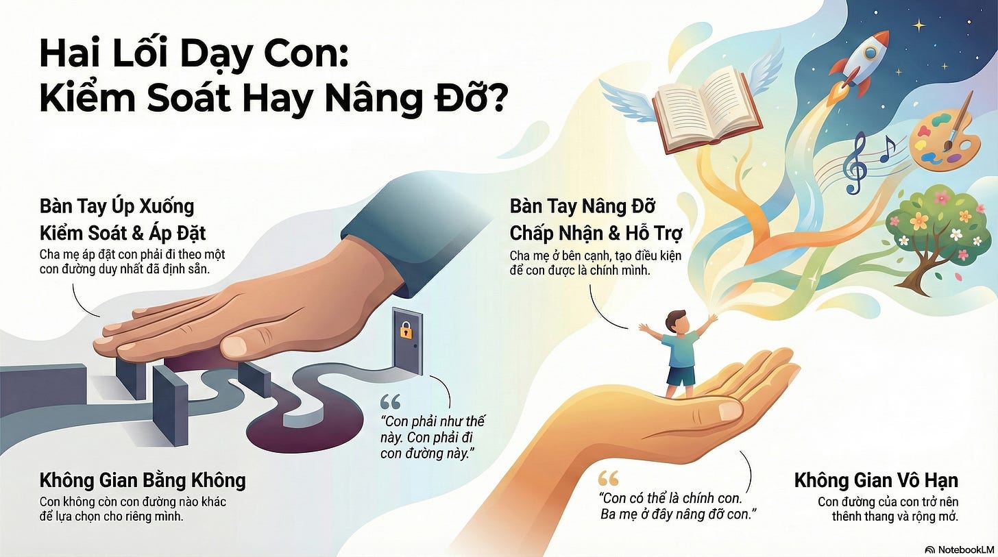 Và trong không gian đó, con tự do: Con có thể là chính con. Con có thể khám phá món quà riêng của mình. Con có thể đi con đường của riêng con, và ba mẹ là người nâng đỡ, không phải người kiểm soát.