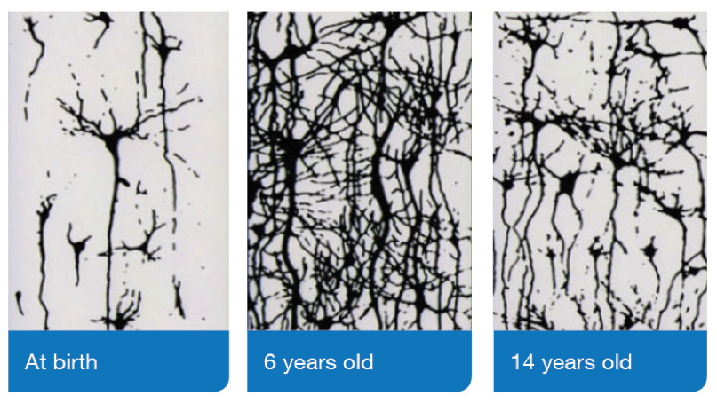 Trong những năm đầu đời, số lượng liên kết thần kinh trong não trẻ tăng bùng nổ, đạt mức cao hơn nhiều so với người lớn; ở khoảng đầu tuổi mẫu giáo, một số vùng vỏ não có mật độ liên kết thần kinh xấp xỉ gấp đôi so với tuổi trưởng thành. Sau đó, não bước vào giai đoạn “cắt tỉa” [pruning]: Những kết nối ít được sử dụng dần bị loại bỏ, giúp mạch thần kinh hiệu quả hơn; ở nhiều vùng, mật độ liên kết từ mức đỉnh thời thơ ấu giảm xuống còn khoảng một nửa hoặc ít hơn khi đến tuổi trưởng thành. Đây không phải thoái hóa, mà là tối ưu hóa, giống cách nghệ sĩ điêu khắc bỏ đi những phần đá thừa để để lộ tác phẩm bên trong.