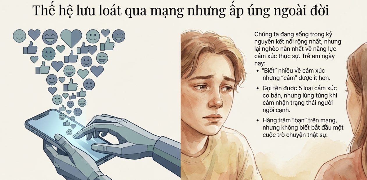 Có lẽ chúng ta đang sống trong kỷ nguyên giàu thông tin nhất, kết nối nhiều và rộng nhất, nhưng đồng thời cũng có thể là kỷ nguyên nghèo nàn nhất về năng lực cảm xúc và kết nối xã hội thật sự. Trẻ em ngày nay có thể “biết” nhiều hơn về cảm xúc nhưng lại “cảm” được ít hơn. Các em có thể gọi tên năm loại cảm xúc cơ bản, nhưng lúng túng khi cảm nhận trạng thái của người ngồi cạnh. Các em thành thạo nhắn tin nhưng ngại gọi điện. Các em có hàng trăm “bạn” trên mạng nhưng không biết bắt đầu một cuộc trò chuyện thật sự với bạn cùng lớp như thế nào. Điều gì đang xảy ra?