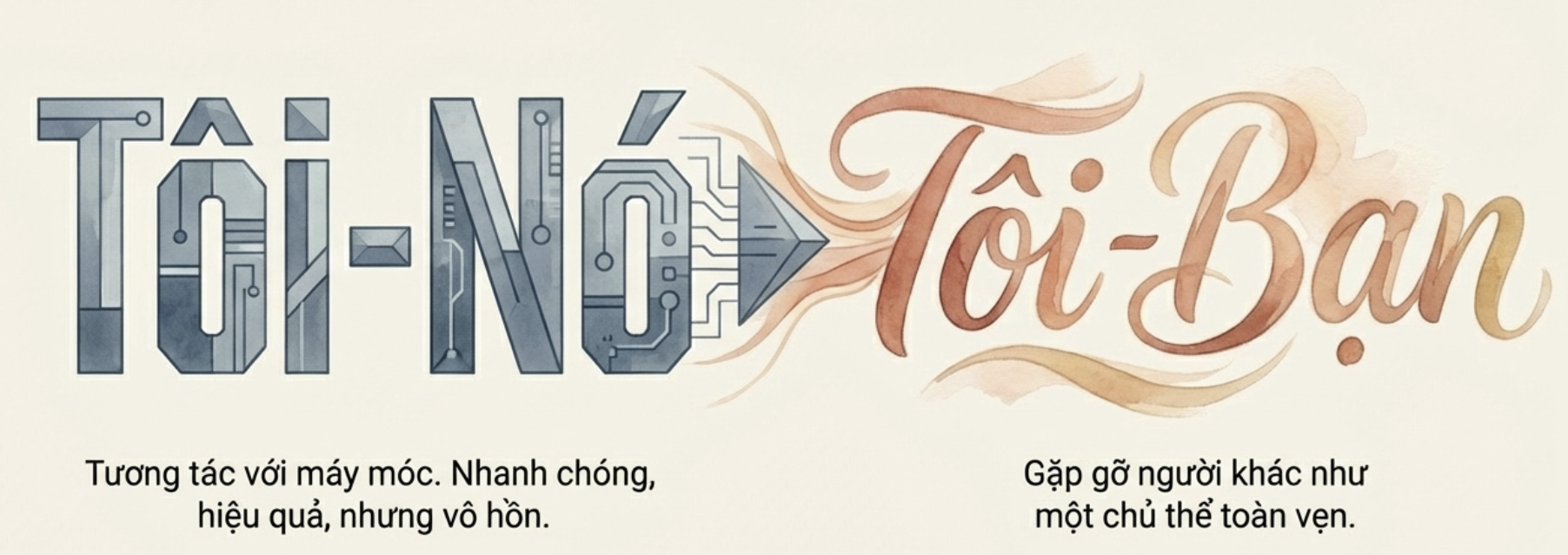 Triết gia Martin Buber từng phân biệt hai kiểu quan hệ căn bản: “Tôi - Bạn” [I - Thou] và “Tôi - Nó” [I - It]. Trong quan hệ “Tôi - Bạn”, ta gặp gỡ người khác như một chủ thể toàn vẹn, với sự hiện diện trọn vẹn. Tôi cho rằng mọi tương tác qua máy móc, dù tinh vi đến đâu, đều mang bản chất “Tôi - Nó”. Chỉ trong sự gặp gỡ trực tiếp giữa người với người, sự gặp gỡ “Tôi - Bạn” mới có thể nảy sinh. Và chỉ trong sự gặp gỡ chân thực, nhân bản đó, năng lực cảm xúc - xã hội mới thật sự được nuôi dưỡng.