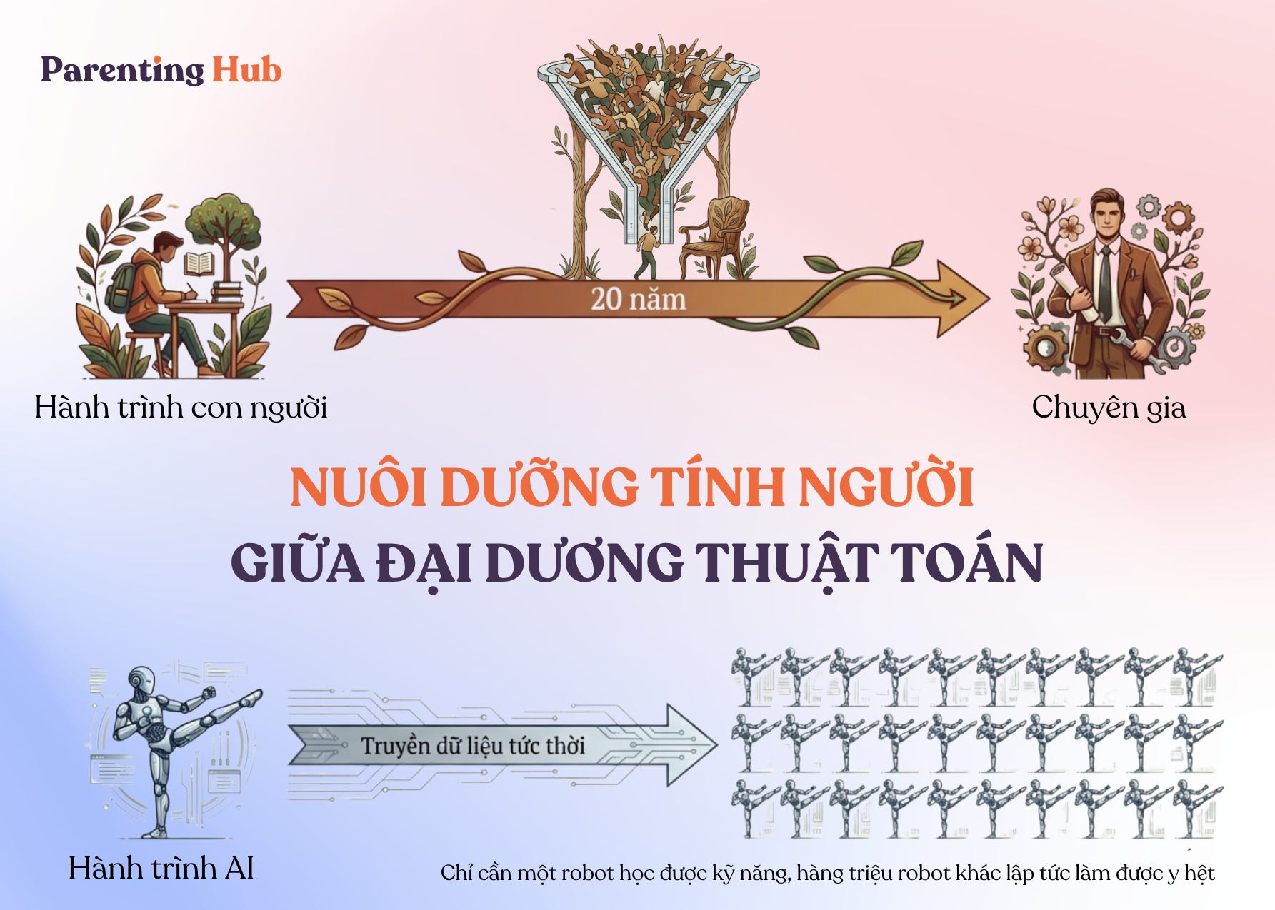Vậy giữa đại dương thuật toán đang cuốn cả gia đình bạn đi, bạn đang chăm gốc rễ hay chăm cành lá? Và bạn đang nuôi dưỡng con để giành một cái ghế có sẵn, hay để con có thể tự kiến tạo con đường của mình?