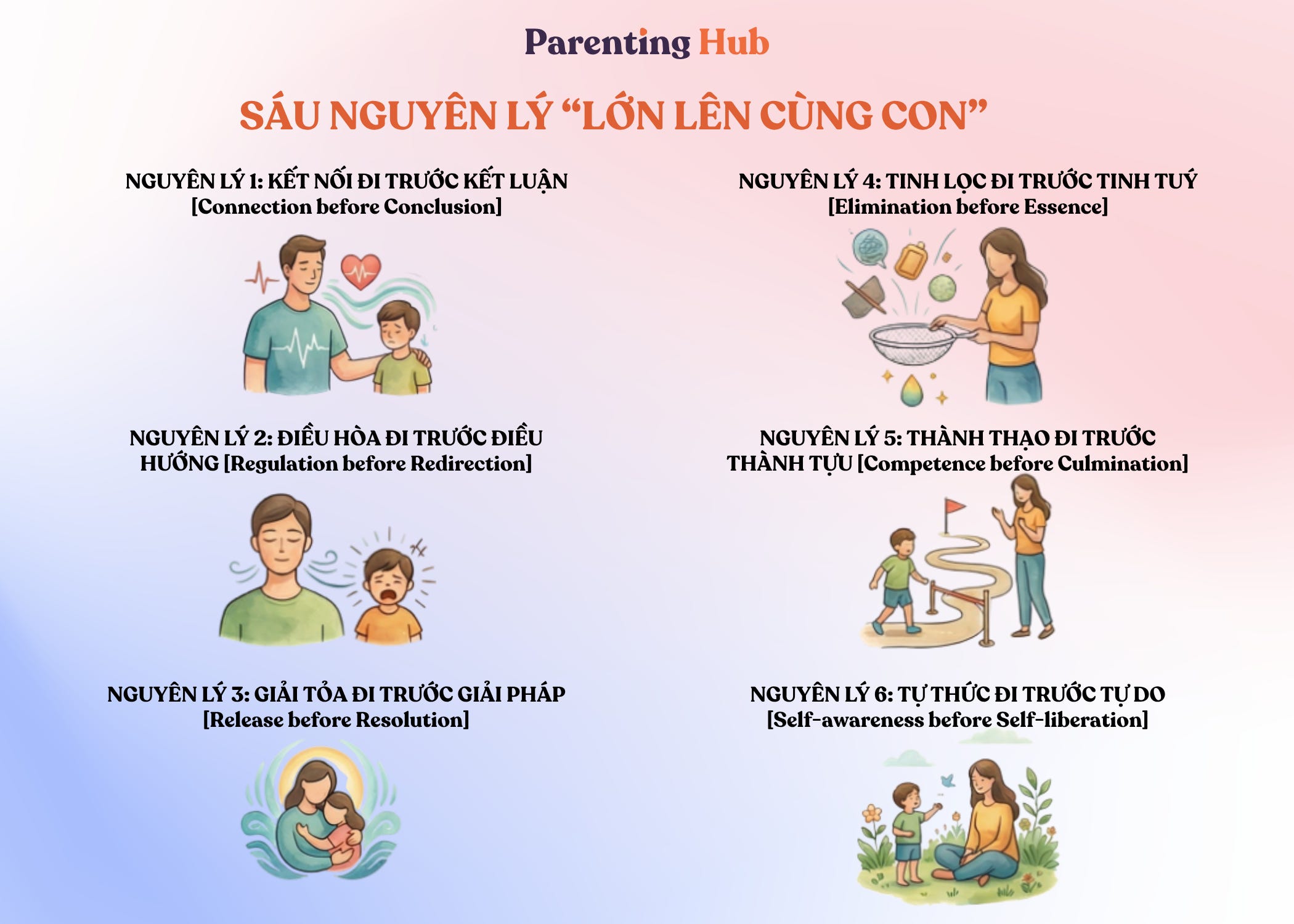 Sáu nguyên lý này không phải là danh sách việc cần làm. Đó là một cấu trúc tinh thần để nhìn lại toàn bộ hành trình nuôi dạy con từ một góc độ khác hẳn: Không phải từ vị trí của người có “đáp án cho cuộc đời” - thứ vốn không tồn tại, mà từ vị trí của hai con người cùng hiện diện trong một cuộc đời, cùng học cách điều hành tâm-thể mình, cùng vật lộn với những giới hạn của bản thân, và cùng nhau lớn lên.