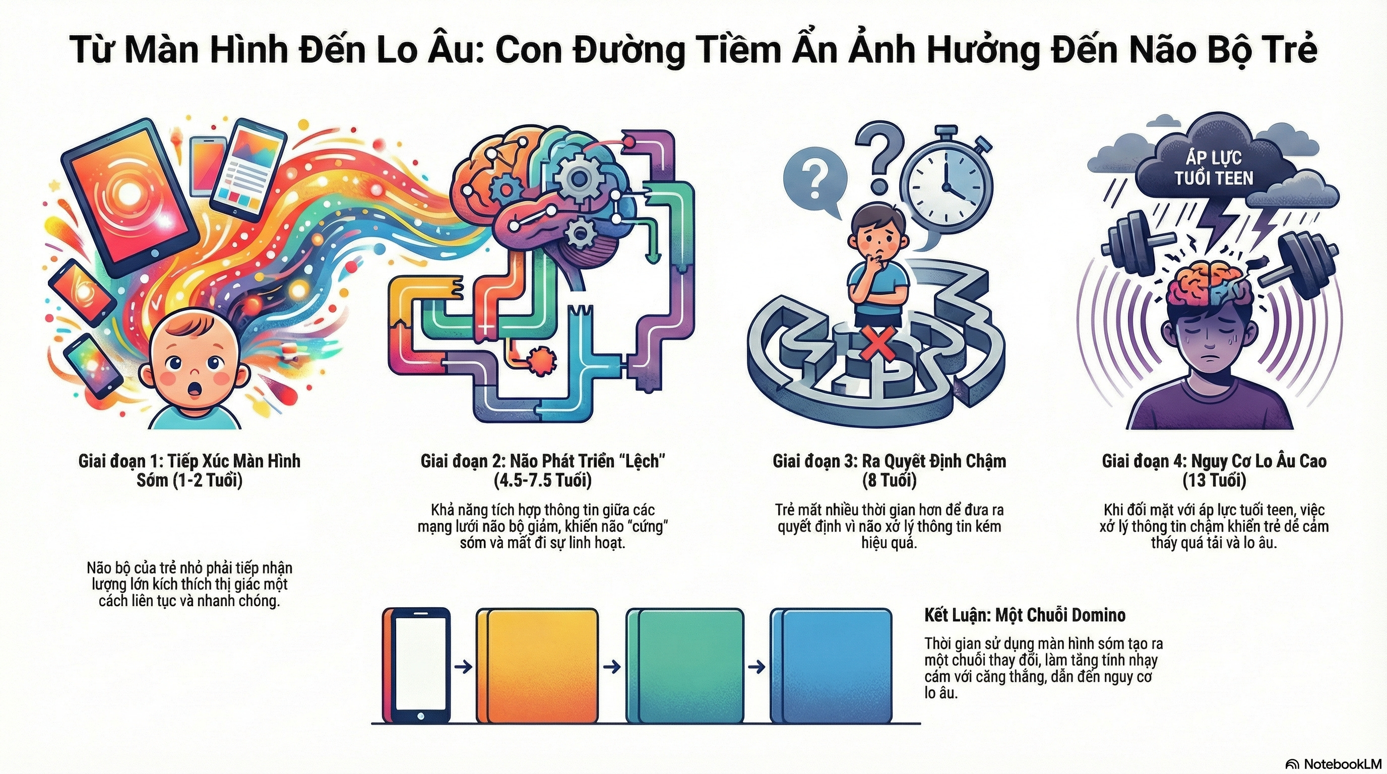 Screen time sớm không trực tiếp “gây ra” lo âu, nhưng: Nó tạo ra một chuỗi thay đổi trong cách não bộ phát triển → ảnh hưởng đến cách trẻ xử lý thông tin và đưa ra quyết định → khiến trẻ dễ bị stress hơn khi đối mặt với áp lực tuổi teen → tăng nguy cơ lo âu.